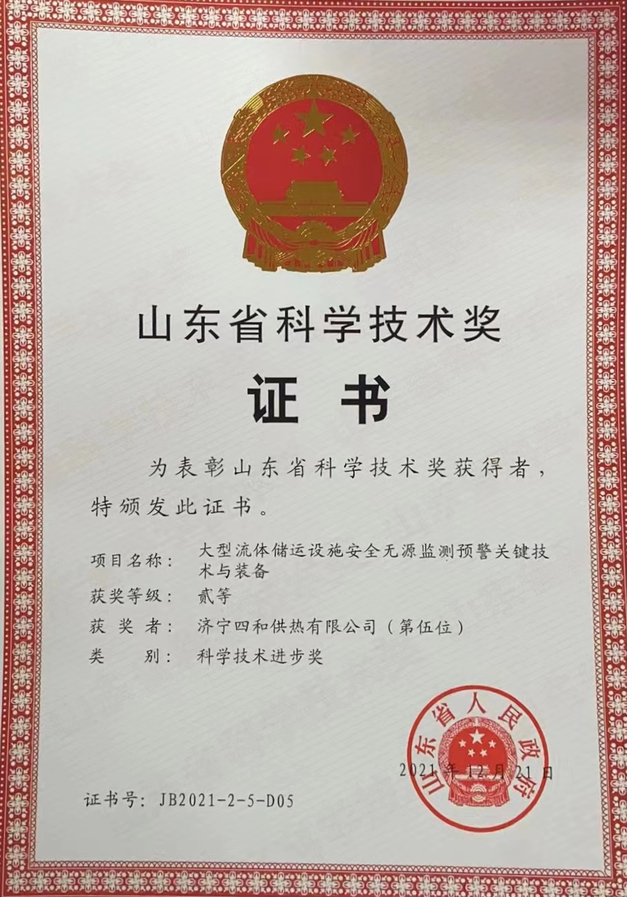 創(chuàng)新驅(qū)動(dòng)發(fā)展、技術(shù)制勝未來(lái)。近日,山東省人民政府發(fā)布《關(guān)于2021年山東省科學(xué)技術(shù)獎(jiǎng)勵(lì)的決定》,正式公布山東省科學(xué)技術(shù)獎(jiǎng)獲獎(jiǎng)名單,對(duì)為山東省科學(xué)技術(shù)進(jìn)步、經(jīng)濟(jì)社會(huì)發(fā)展作出突出貢獻(xiàn)的科學(xué)技術(shù)人員和組織給予獎(jiǎng)勵(lì)。濟(jì)寧四和供熱有限公司參與完成的“大型流體儲(chǔ)運(yùn)設(shè)施安全無(wú)源監(jiān)測(cè)預(yù)警關(guān)鍵技術(shù)與裝備”項(xiàng)目名列其中,榮獲“山東省科學(xué)技術(shù)獎(jiǎng)二等獎(jiǎng)”。