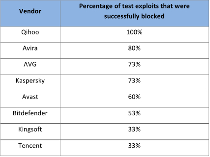 在COSEINC測(cè)試中,360安全衛(wèi)士攔截全部15次漏洞攻擊,防御成功率排名第一;Avira(小紅傘)成功攔截12次攻擊,以80%的攔截率排名第二;卡巴斯基和AVG均攔截11次攻擊,并列第三位。
