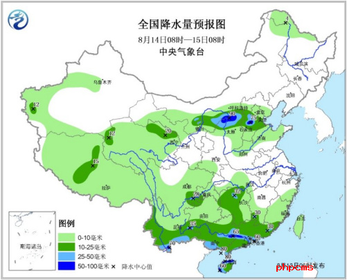 圖3 全國降水量預(yù)報(bào)圖(8月14日08時(shí)—15日08時(shí))