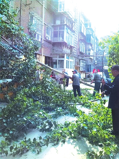 感覺到事態(tài)嚴(yán)重,記者馬上聯(lián)系到了小區(qū)所屬的貿(mào)東街道辦事處。當(dāng)日上午,貿(mào)東街道辦事處勞動路社區(qū)的書記宋起林趕到現(xiàn)場查看了情況,小區(qū)里通道狹窄并且樹干很粗很高,鋸下枝干并非易事。宋書記馬上與該院產(chǎn)權(quán)單位邯鄲洗選廠進行協(xié)商。隨后,居委會和廠子積極聯(lián)系伐樹工人。他們找了幾家專業(yè)的伐樹隊,可是人家一聽說小區(qū)的情況都不干。宋書記終于找到一家,可伐樹隊昨天上午又打了“退堂鼓”。情況緊急,洗選廠決定下午派工人去伐樹。
